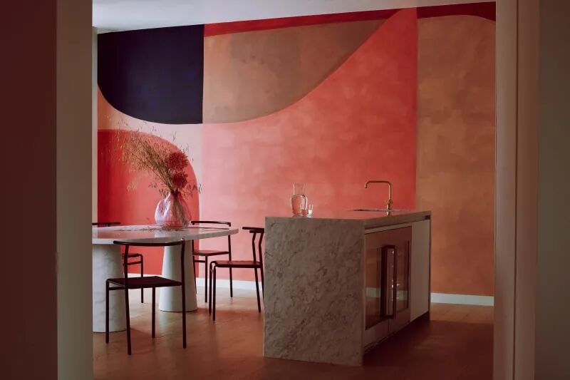 公寓的餐厅,大面积几何形状和图案,深浅不一的色块不规则交织在一起,组合成一个发光、温暖、优雅的空间,不仅充满魅力,还充满了她时尚品牌的设计 DNA。