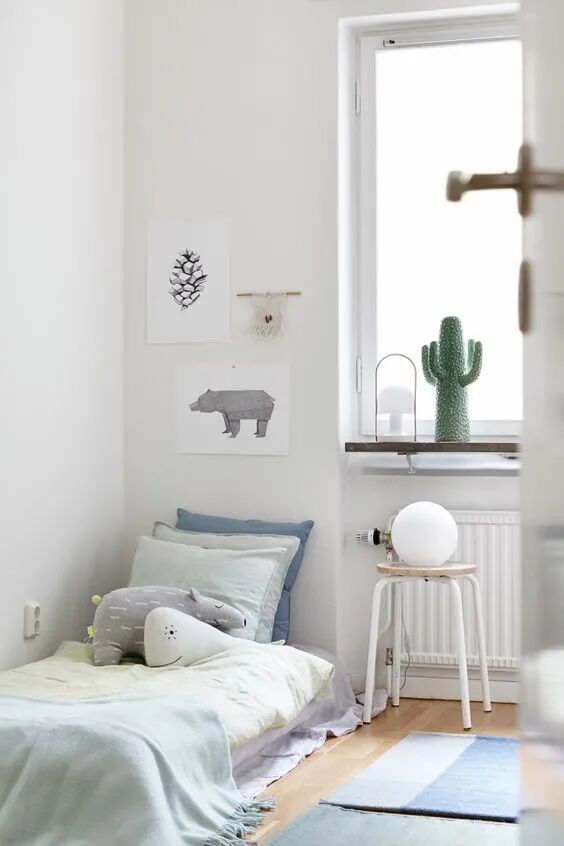 不想要太花哨的花纹的男孩子房间,放心大胆用这款色系吧!拥有中性色的地毯和灰色的墙壁,则可以轻松实现这种简单而优雅的风格。对于床单,请使用原色的大型简单图案。使用的白色越多,外观就越干净现代!