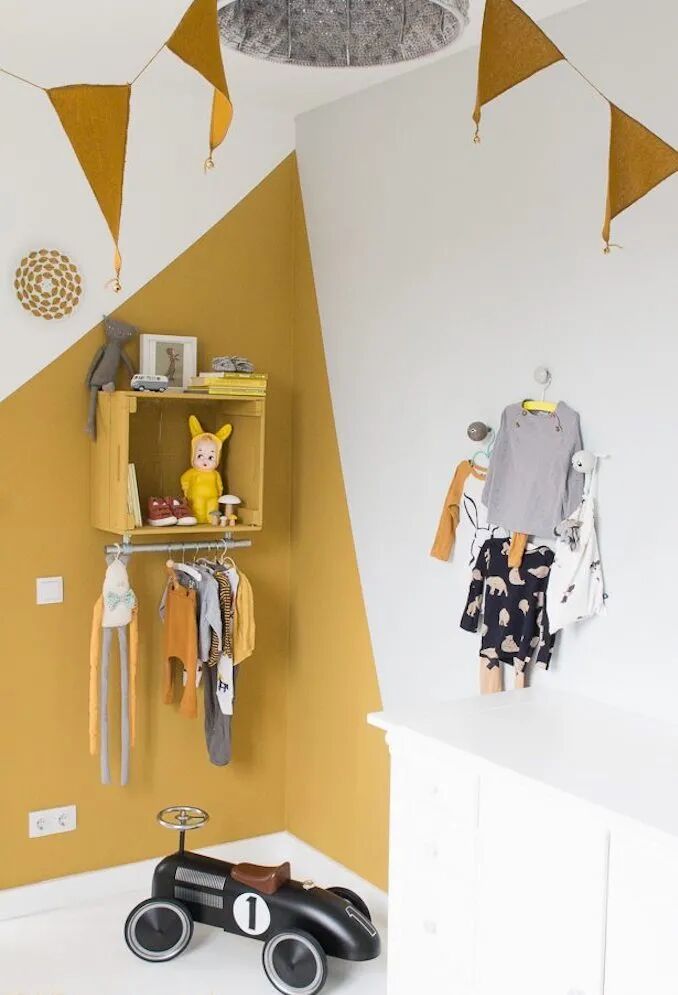 黄+灰不规则的搭配也是可供参考的一种方式。不拘泥于墙面,配合喜欢的装饰玩起来吧!满足孩子新奇大胆的想法,让孩子自己爱上自己的房间,才是合格的儿童房啊。