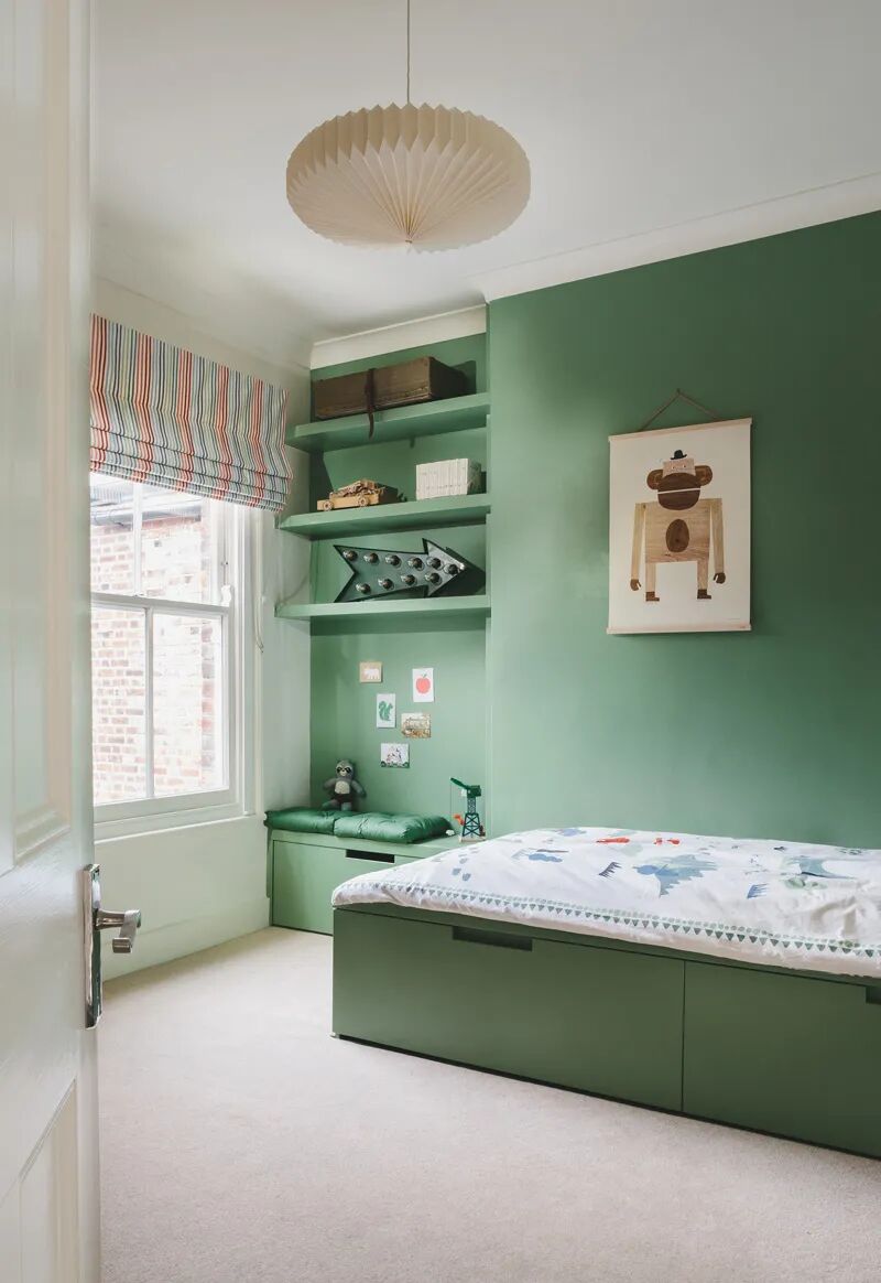 大面积的绿色尽情适用吧!但注意房间的采光,面积不足10㎡的房间以浅色为主,太深的颜色容易让孩子产生视觉疲劳。把森林搬回家吧,让孩子在丛林里尽情的探险。