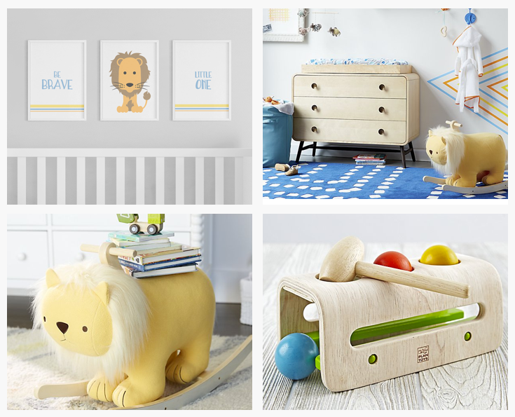 很多小朋友喜欢狮子、老虎,作为森林的霸主,喜欢狮子的孩子内心是自信开朗,活泼好动的。黄色的狮子作为房间的重点色,明亮温暖。同时辅助以灰色为基色,显得干净利落。