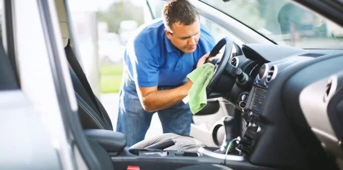 使用KK强力清洁剂喷洒擦拭,重点位置包括:车把手、方向盘、中控台、座椅等。